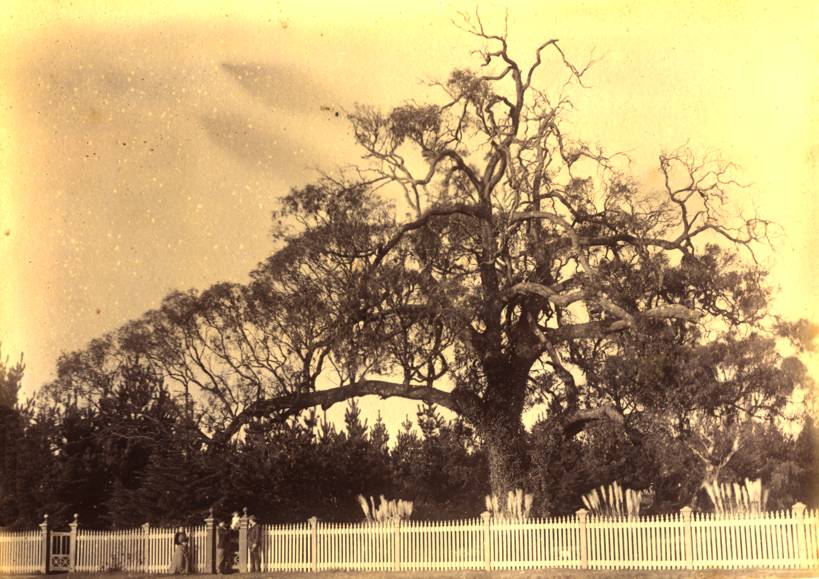 When the Shaws arrived these two houses stood at the "edge of civilisation" (see 1887 map). To the west was the slightly more densely populated bayside area of Brighton while to the east market gardens stretched into the distance. Across South Rd, outside Brighton, was the "Castlefield" property, the homestead of which still stands within Haileybury College. Much of the land had been cleared for agriculture but on the Hampton Street boundary of "Hiawatha" there still stood an old and massive red gum seen in the photo at the right. The group stand at Hiawatha's gate with the matching gate of Chevy Chase further along ther fence.