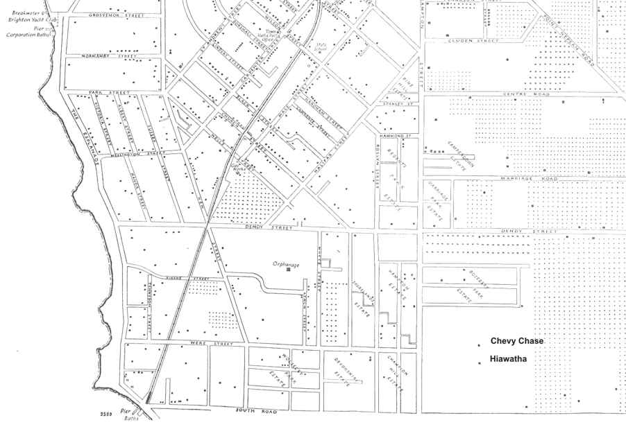 Each stood on a 10 acre "home" block stretching from Hampton Street to about the current Mirams Street. At various times in the late 1800s these two estates took in much of the surrounding land as well. In 1891 Alfred Shaw is said to have owned an additional 19 acres extending to South Rd and most likely including the current site of St Leonard's College (and possibly being the balance of the 39 acres mentioned above). The Chevy Chase estate at its most extensive was bounded by Hampton St, Binnie St and Canberra Grove with an arm of land fronting South Road.