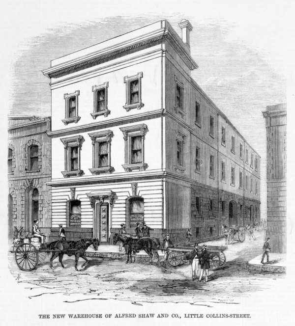 The 1868 directory shows the address of Alfred Shaw & Co as 42 Little Collins St West, likely a temporary premises arranged for the period Alfred was overseas. The following year the firm was at 13 Little Collins Street West (later renumbered to 360 Little Collins) where the firm was to maintain a presence until well into the following century. The indications are that in 1869 he used a bluestone warehouse already on the site before incorporating it as part of the ground floor of a new three story building. During the construction he used 38 Elizabeth Street around the corner as his business address. The new building, completed in late 1871 had "a frontage of 40 ft. to Little Collins-street and a depth of 127 ft., containing a cellar, ground floor and two upper flats, each floor being occupied by all the various articles of a complete wholesale hardware business" (Sutherland). The bluestone wall along Gill's Alley with its arched cart entry is still standing having been incorporated into a 1930s renovation carried out when the building passed to Guest's Furniture Removalists. Benjamin Hill whose family jewellery business bought the building in the 1970s recalled evidence of stables being discovered when the rear of the building was excavated for a truck rental company.