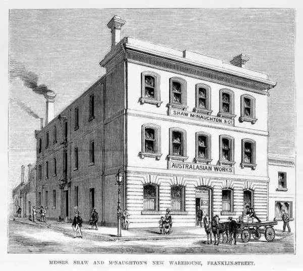 4 State Library of Victoria Wood engraving published in The illustrated Australian news., MESSRS. SHAW AND McNAUGHTON'S NEW WAREHOUSE (Viewed 1/7/2007)