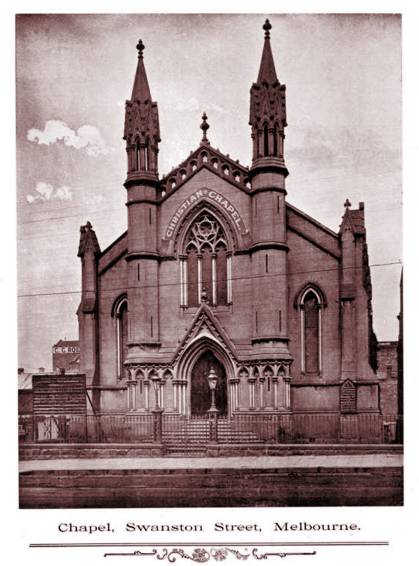 From at least as early as 1870 he was involved with the Church of Christ in Australia. Initially this was in Balaclava where fellow ironmonger Benjamin Hill was also involved. Later he was involved with the Swanston Street church and according to their web site he assisted with the purchase of the church building (pictured) ......