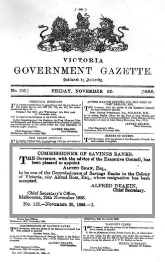 1888 to 1890 BANK COMMISSIONER In November 1888 Alfred was appointed a commissioner of The Savings Banks of the Colony of Victoria