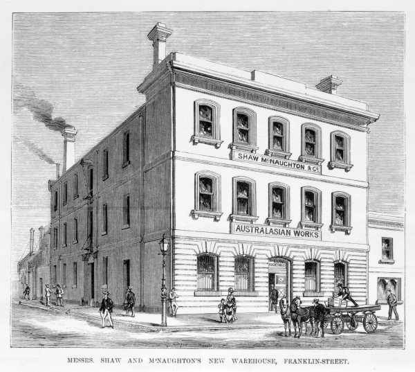 State Library of Victoria, Title:MESSRS. SHAW AND McNAUGHTON'S NEW WAREHOUSE, FRANKLIN STREET. [picture] Accession number(s):IAN21/03/77/44 Date(s) of creation:March 21, 1877. Publication:Melbourne : Ebenezer and David Syme, Medium:print : wood engraving. Collection:Illustrated newspaper file. Illustrated Australian news Contents/Summary:Shows factory on the corne r of Franklin and Stewart Streets known as the Australian Tin Stamping and Japanning Works; three storey building, iron bars over the ground floor windows. Notes:Wood engraving published in The illustrated Australian news. Title printed below image l.c. Subject(s):Shaw, McNaughton & Co. .