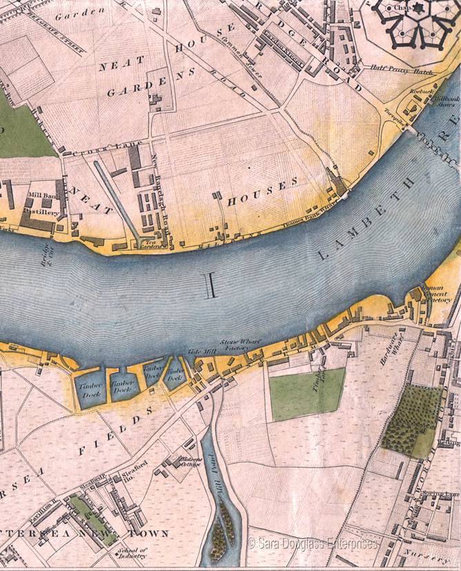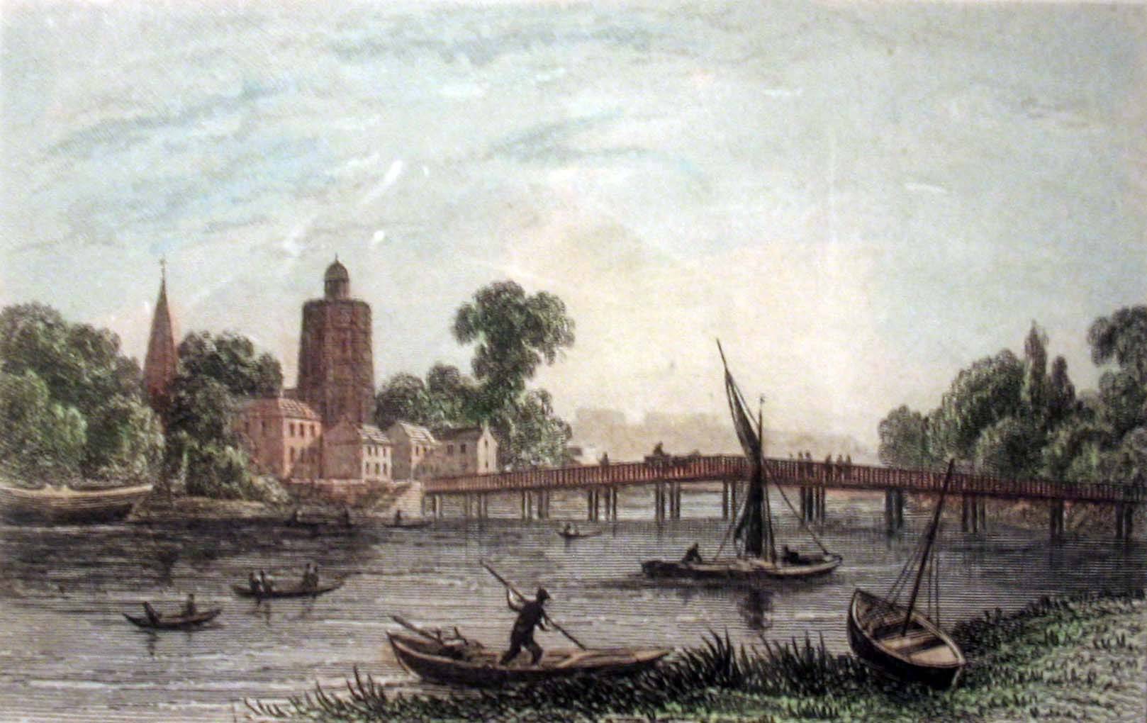 General Notes: Battersea Painting (above) The painting shows a Thames waterman and the church of Jame's children's baptisms. "Battersea Bridge, St Mary's Church and the curious old Windmill, from a print of about 1840, first published in "Curiosities of Great Britain, England and Wales Delineated", by Thomas Dugdale. The colouring is modern. Battersea wooden bridge was constructed 1771-1772 to Henry Holland's original design and made famous by Whistler's Nocturne: Blue and Gold - Old Battersea Bridge , 1872-77 now in the Tate Britain. It was black spot for river transport with cargo boats regularly colliding with the bridge at night or in fog. Replaced 1886-1890 with the current Battersea Bridge to Sir Joseph Bazalgette's design of cast-iron arches" - http://www.milsom.info/Battersea/ Chronology: He worked as a Barge Builder opposite the Nine Elms Public House 1817 to 1834 and resided at Nine Elms Lane, Battersea, Surrey. 8
