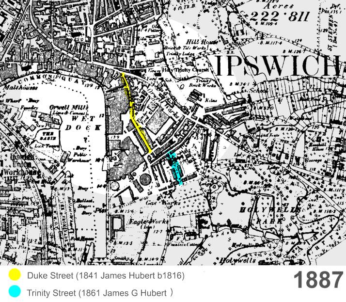 In the 1822 Pigott's London Directory an entry appears for "Hubert Jas, Nine Elms, Battersea" under the Boat and Barge Builders section.This is almost certainly either our James George (then about 28) or possibly his father James about whom we know very little. From the 1827 Greenwood map of this area we can see that the area consisted of only a few buildings along Nine Elms Lane running just south of the river between Battersea and Vauxhaull. He worked as a Barge Builder in 1826 and resided at Nine Elms, Surrey. 11 In 1841 he was still at Nine Elms Lane, Battersea, Surrey with his wife and seven of their children. His eldest son, also James, had married and was now a Shipwright in Ipswich where the rest of the family was to move in the 1850s. Son Charles was recorded as an Engineer. 12 13 In 1851 he was still in Nine Elms, Surrey. At home was his daughter Elizabeth, 30 and a School Mistress, William, a Lighterman, Samuel, an Instrument Maker and Ann still at school. Next door was son George, also a Barge Builder, with his wife and daughter (it is worth noting that George's wife Leonora was born in Ipswich).
