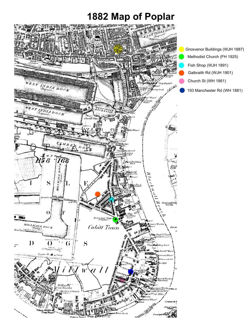 In 1891 he was a Police Constable living at a Fish Shop, 1 Strattondale Street, Poplar with wife, family and brother-in-law Robert Roberts, Fishmonger. Number 1 must have cosisted of at least 9 rooms with those mentioned in five or more. Three other families lived occupied another 4 rooms including that of another brother-in-law William Henry Roberts. In 1901-1911 he was a Metropolitan Police Constable living at 44 Galbraith Rd, Poplar with wife and seven of their children. Fred was two months old. In Mar 1912 he was the Pensioned from Police. 21 He resided in Mar 1915 in 246 Manchester Road, Poplar. 22