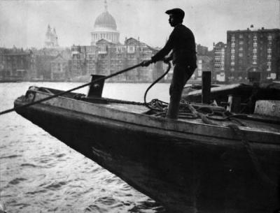 Description: A silhouette of a London lighterman. St Paul's Cathedral can be seen in the distance. The lightermen conveyed goods between the ships and the quayside. They took their name from this process of 'lightening' the ship. The lightermen secured the 'free water clause' allowing them to be exempted from charges in the enclosed docks that were built during the 19th century. They were thus able to enter the docks and receive or deliver goods directly to or from vessels.