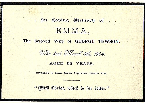 Chronology: Death: 4 Mar 1952, Long Eaton. Emma married George Tewson in 1871 in Shardlow (reg).1 (George Tewson was born Cal 1849 in Shardlow (reg).) |
